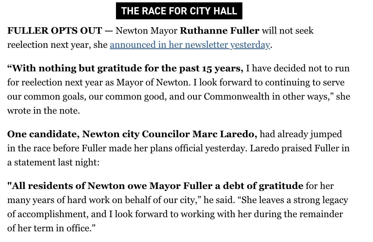 "All residents of Newton owe Mayor Fuller a debt of gratitude for her many years of hard work on behalf of our city. She leaves a strong legacy of accomplishment, and I look forward to working with her during the remainder of her term in office."